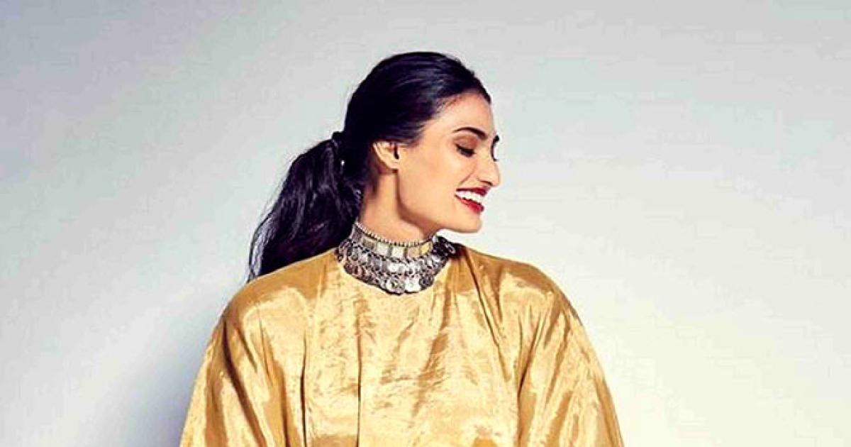 IMAGE: Gold is good, especially when it is like Athiya Shetty's kurta set by Anavila. She styled the look with a contrasting choker and mojaris. Photograph: Courtesy Anavila/Instagram