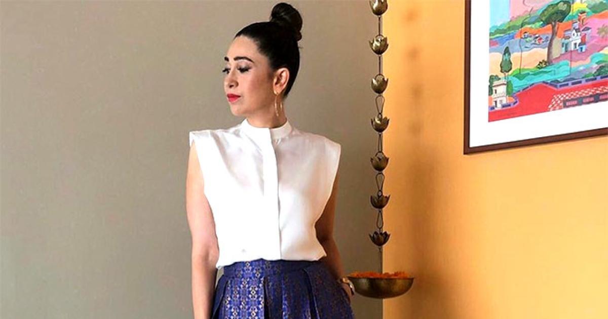 IMAGE: Take a cue from Karisma Kapoor on how to wear a white top with a traditional lehenga skirt. She completed the look with a top-knot and white sneakers. Photograph: Courtesy Tanya Ghavri/Instagram