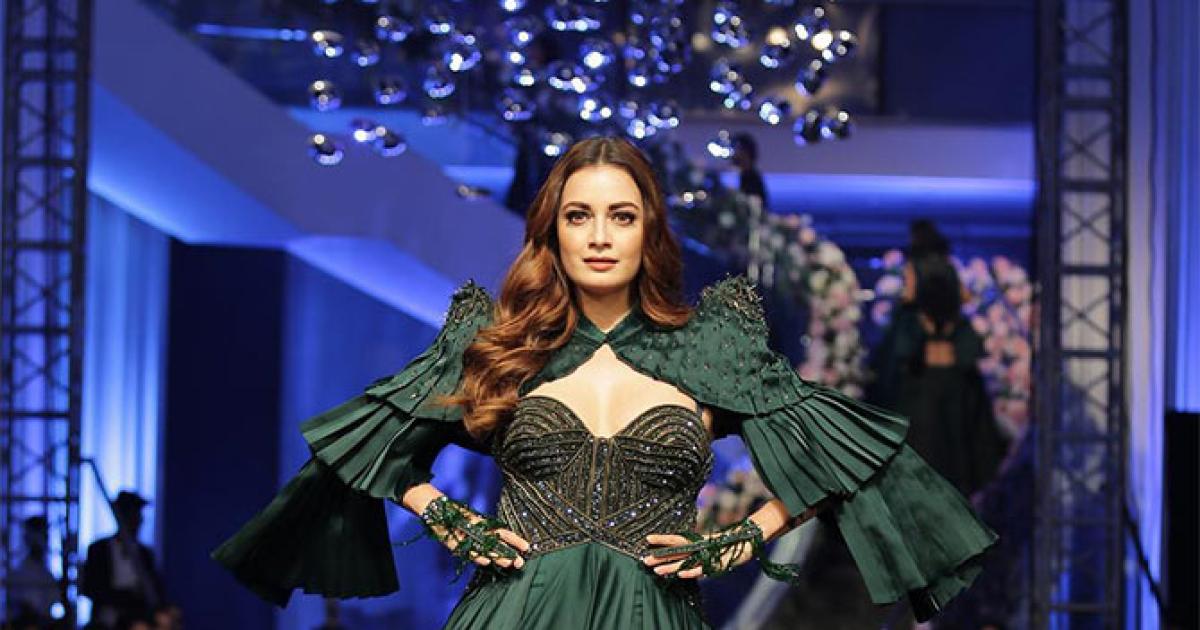 Looking sensational in a green gown, paired with an embellished jacket, showstopper Dia Mirza cut an elegant figure as she walked the ramp at Pune's J W Marriott Hotel for designers Shantanu and Nikhil.