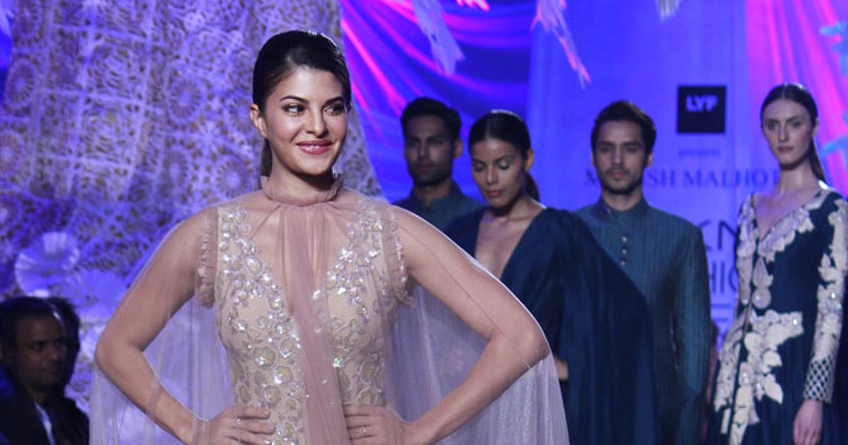 Showstopper Jacqueline Fernandez looked ethereal in a floor scraping embellished gown with a long cape.