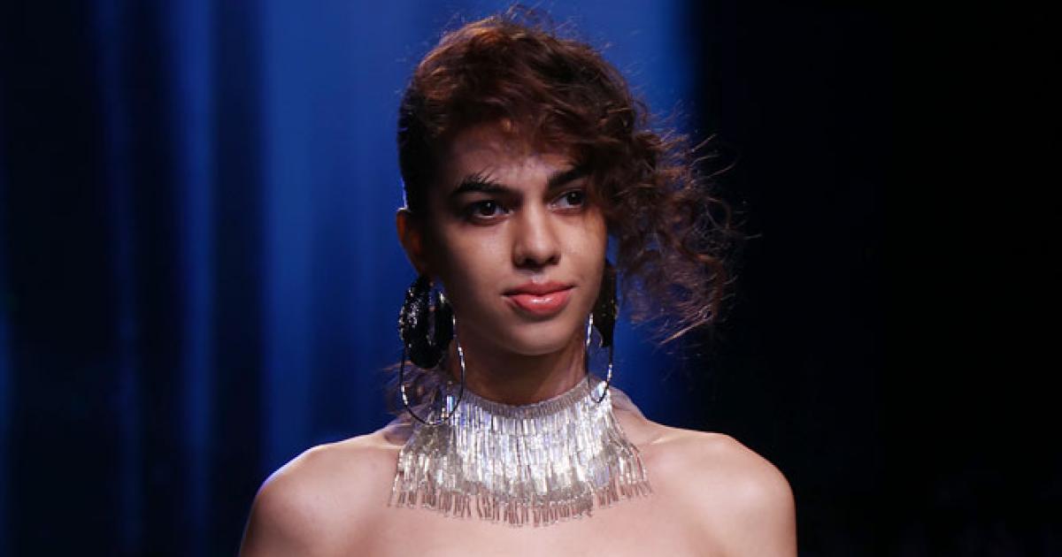A model dressed in the patchwork dhoti with a bow tie top and printed cape.