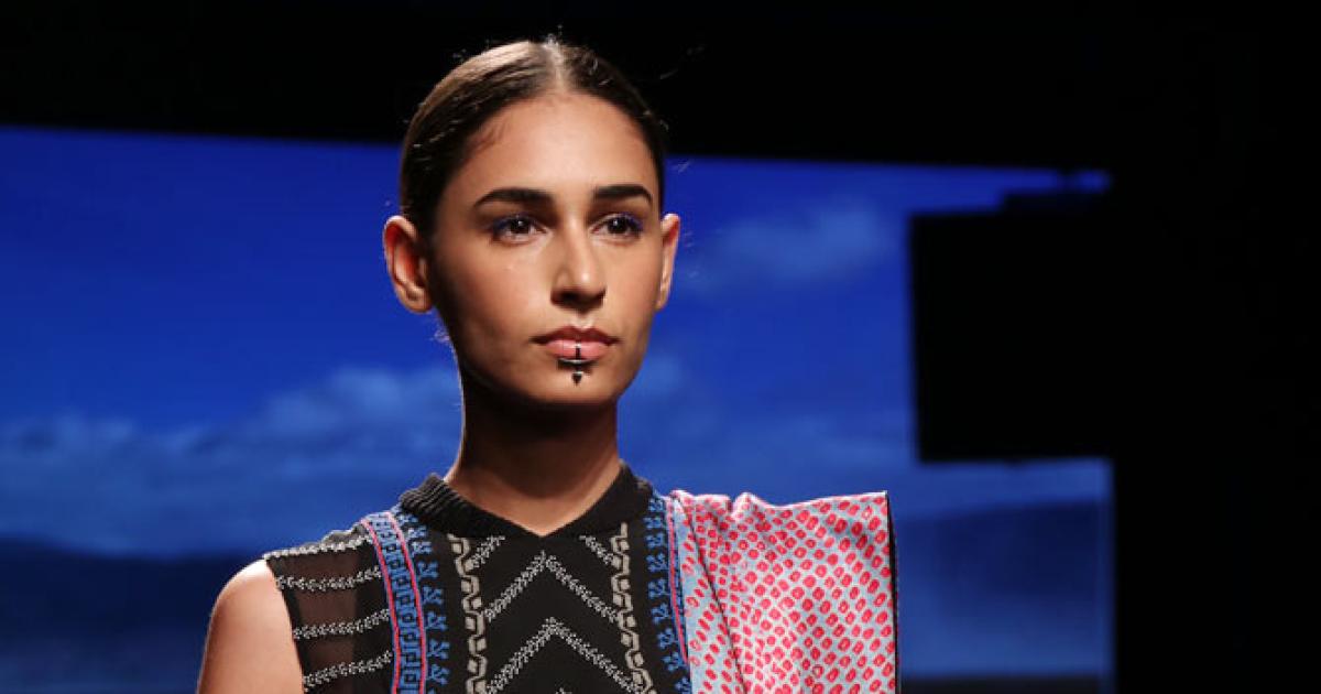 IMAGE: A model wears a printed creation in black and red inspired by the tribe.