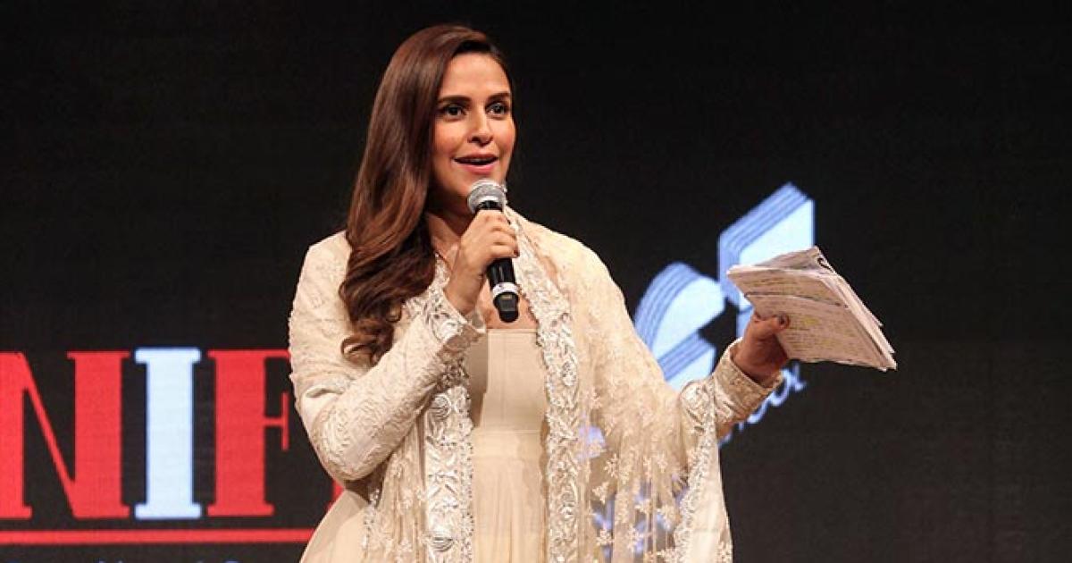 Neha Dhupia, one of the chief influencers of the programme came dressed in a cream asymmetrical anarkali with an embroidered dupatta.