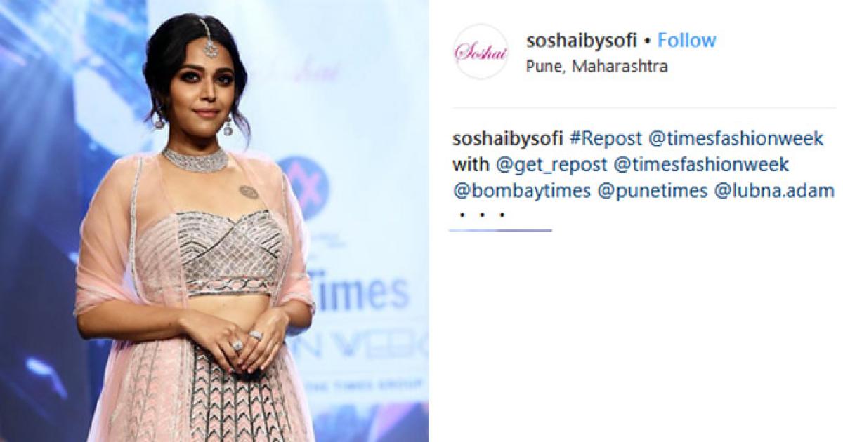 'The stunning @reallyswara takes our breath away in a @soshaibysofioutfit as the showstopper for the Pune fashion Week 2018 by @timesfashionweek,' wrote the designer on Instagram as she unveiled pics of her collection titled Ruh.