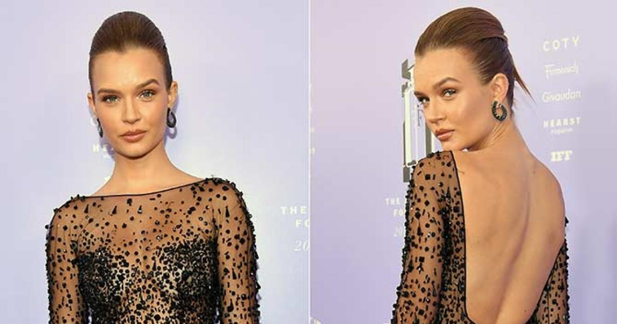 Josephine Skriver stunned in a black sequinned sheer dress with fringed sleeves. Photograph: Dia Dipasupil/Getty Images