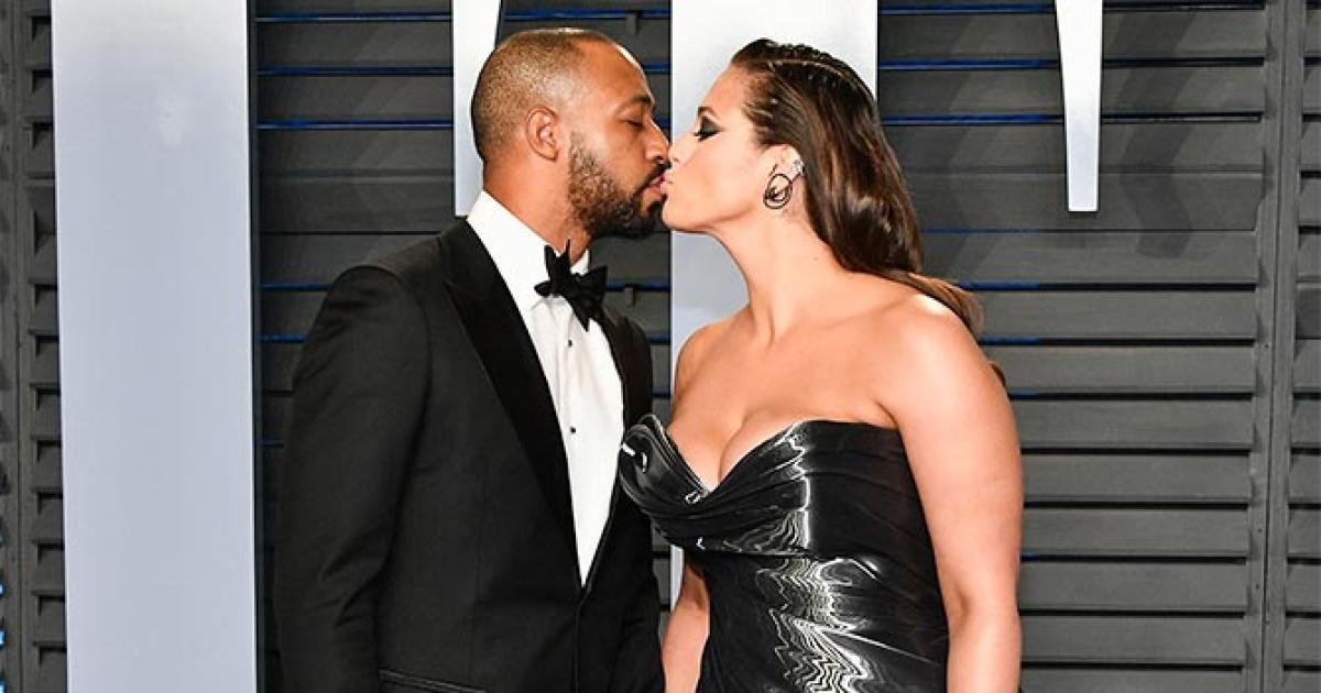 Ashley Graham, who was dressed in a liquid draped gown by Rubin Singer, shares a passionate kiss with her husband Justin Ervin on the red carpet.