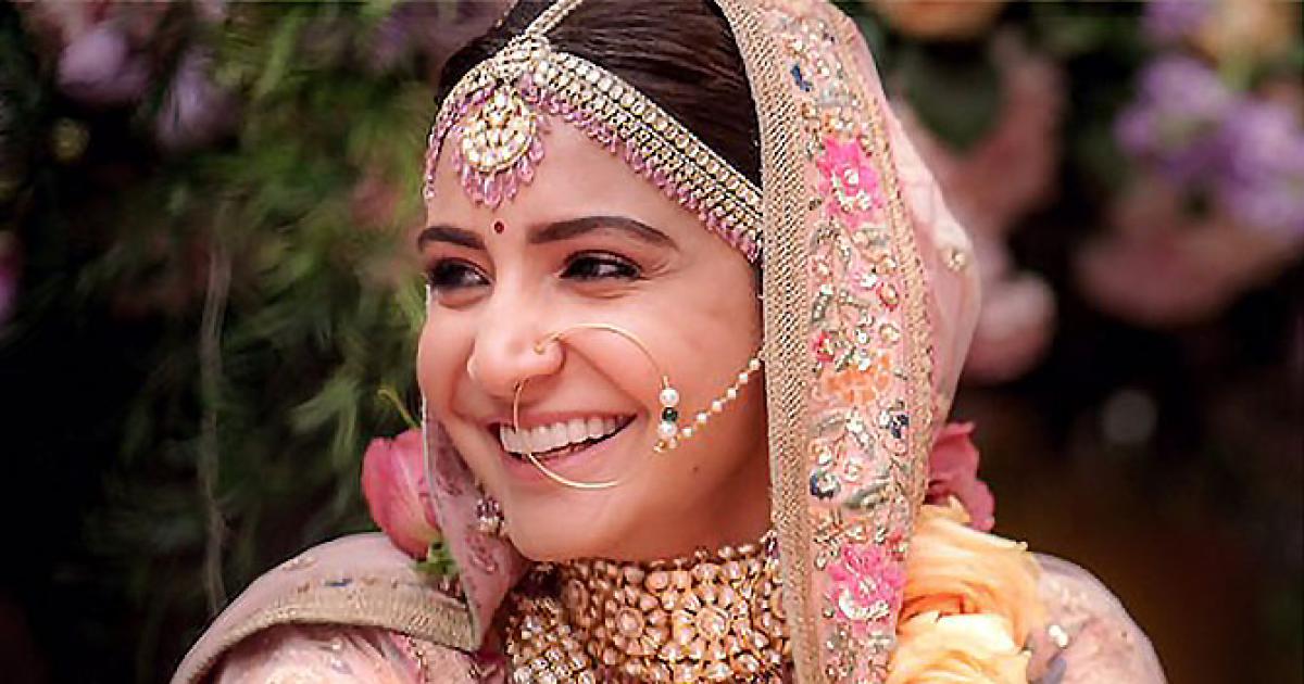 Anushka Sharma wore a pale pink lehenga with Renaissance embroidery in vintage English colours.
