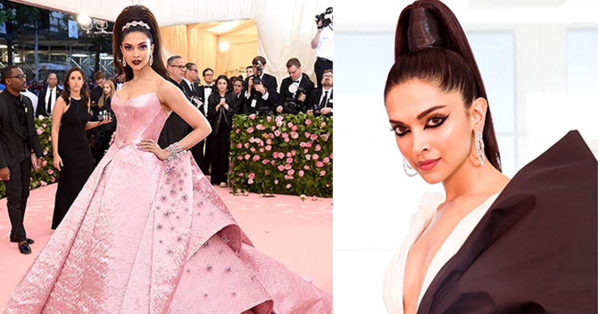 IMAGE: One of Deepika Padukone's most repeated and comfortable looks for the red carpet is her slick pulled back pony, which we understand works well to highlight her jawline and her famous winged eye makeup. She recently made her third appearance at Met Gala looking like a Barbie doll in a pulled back pony. She repeated the look for her recent Cannes outing. Photographs: Jamie McCarthy/Getty Images (left) and Deepika Padukone/Instagram