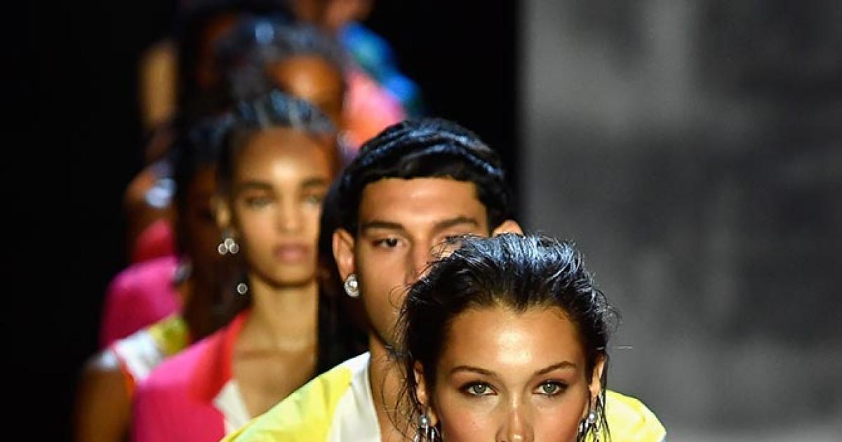 Here come Prabal Gurung's models! Bella Hadid dressed in a violet and vermillion colour-blocked oversized nylon windbreaker with drawstring detail.
