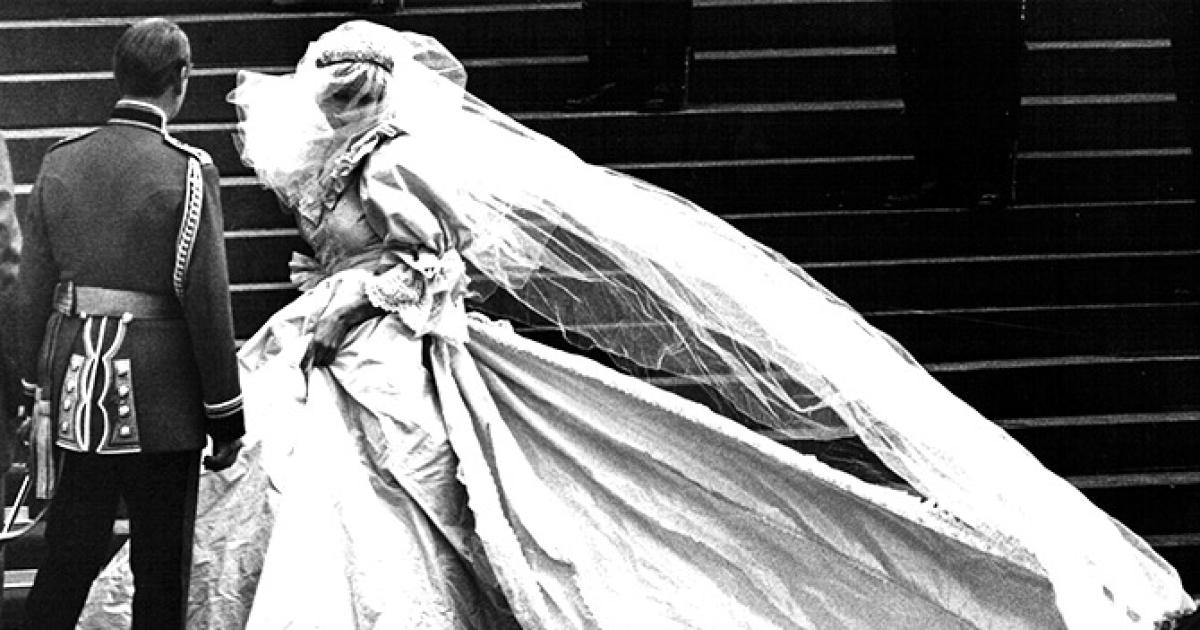 Diana's ivory silk taffeta and antique lace dress -- with puffed sleeves and a huge train behind her --is definitely one of the most iconic wedding gowns of all time.