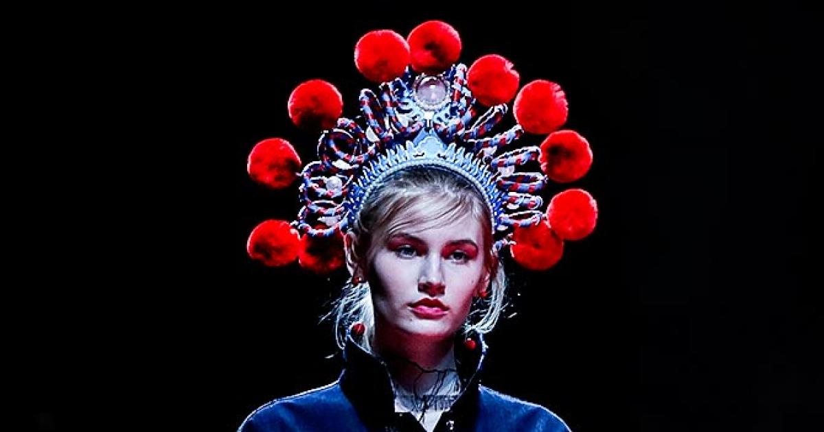 A model walks down the ramp showcasing the Chenwen studio collection by designer Chen Wen, dressed in a contemporary denim shirt dress worn with a traditional Chinese headpiece.