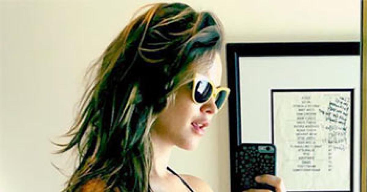 This is a pic from a weekend getaway, when she rocked a blue bikini with a Fedora white hat.