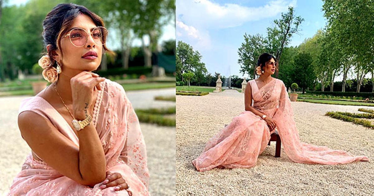 IMAGE: Priyanka Chopra shared an adorable pic of her dressed in a pink Sabyasachi sari and we can't stop gushing about how chic this desi girl looks! She completed the look with round-rimmed glasses and pink lips. Photograph: Courtesy Priyanka Chopra/Instagram