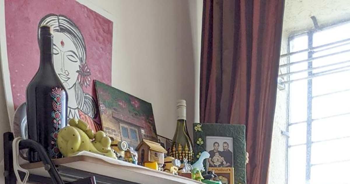 "I've added two of my own paintings to the space -- one inspired by a lotus pond in Goa and the other a spiritual piece featuring the unalome symbol, which represents rising through the mud and the spiral journey of life," Shristi explains.