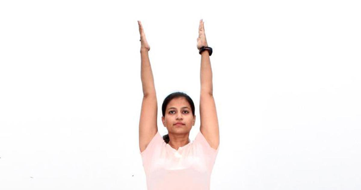 This pose is also described as a Palm Tree pose and helps in upward stretch of the whole body. It is done by balancing on your toes.