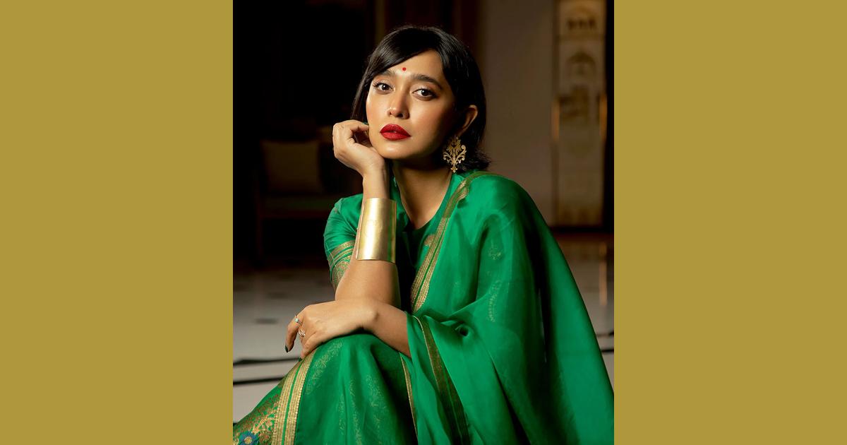 IMAGE: Sayani goes full desi in her beautiful green lehenga by her self-proclaimed fave brand, Raw Mango. She completes the traditional look with a simple red bindi, red lips and gold accessories.