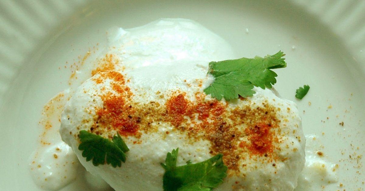 - Place all the baras at the bottom of a flat glass bowl and pour the chilled dahi mixture over them.