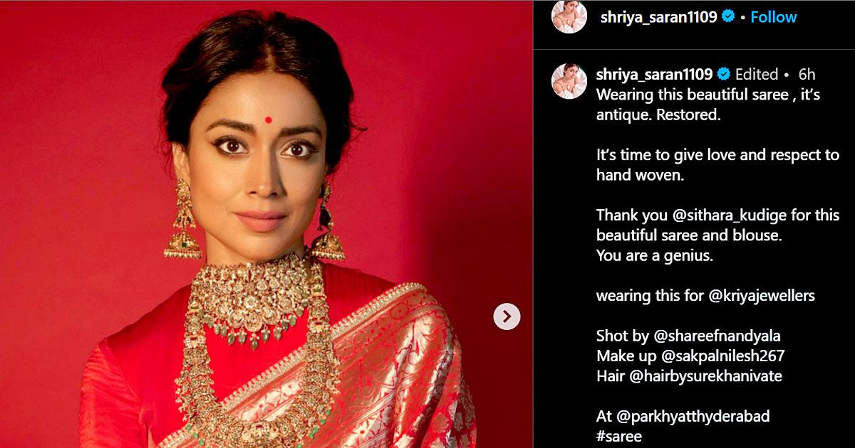 Looking stunning in a traditional sari, Shriya Saran wrote, 'Wearing this beautiful sari, it’s antique. Restored.