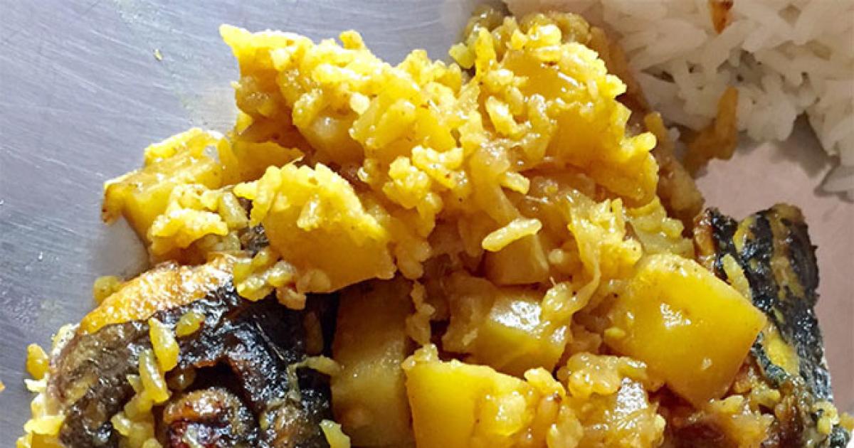 The side dish, she says, is cooked with rice and fried fish head of rohu or katla (known as maacher matha or muro in Bengali).