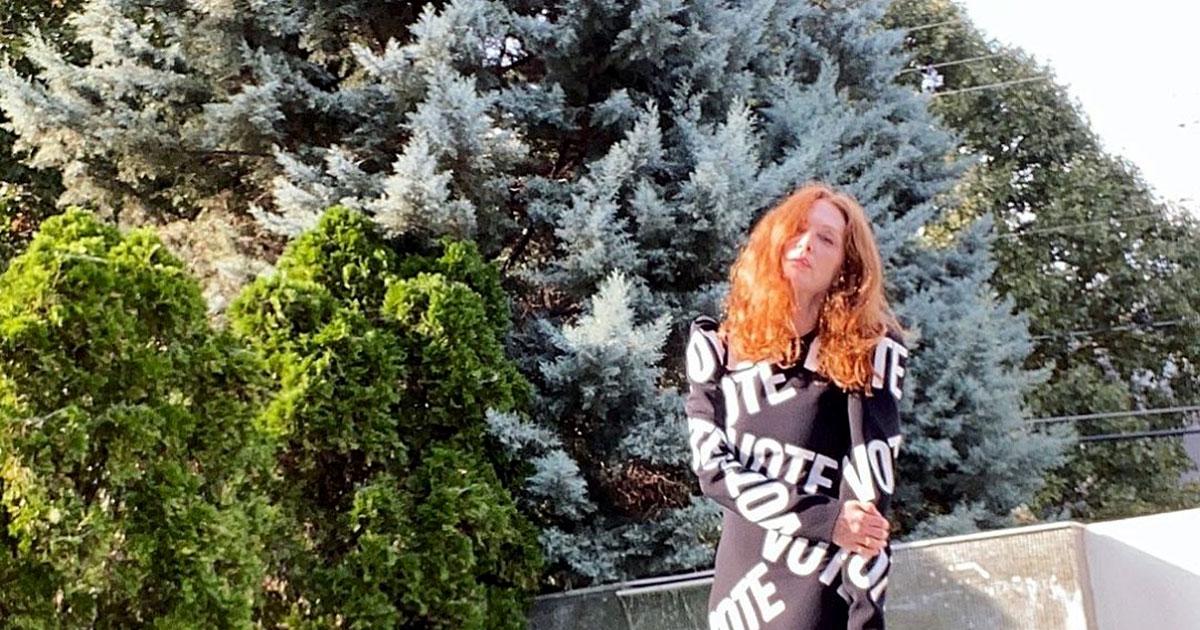 Designer Christian Siriano sent across a powerful message as he unveiled his latest collection on Instagram with actor Julianne Moore dressed in a black gown, below, with the word 'Vote' inscribed all over it.