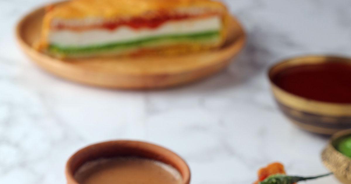 Apply the mint chutney on one triangle and the chilly paste mixed with tomato ketchup on the other one.