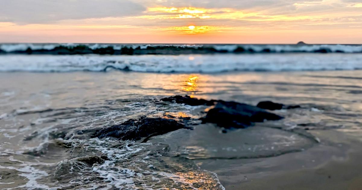 "There are rocks on one side of the beach giving a vibrant view during sunset."