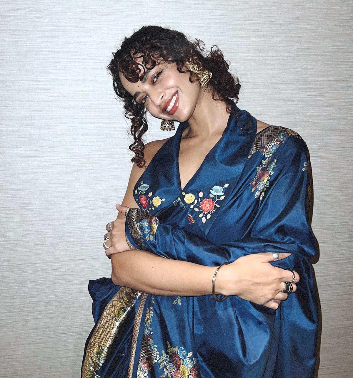 IMAGE: Anjali looks pyari in a blue silk sari; its hand-painted florals and halter-neck blouse give the drape a fresh, modern spin. All photographs: Anjali Sivaraman/Instagram