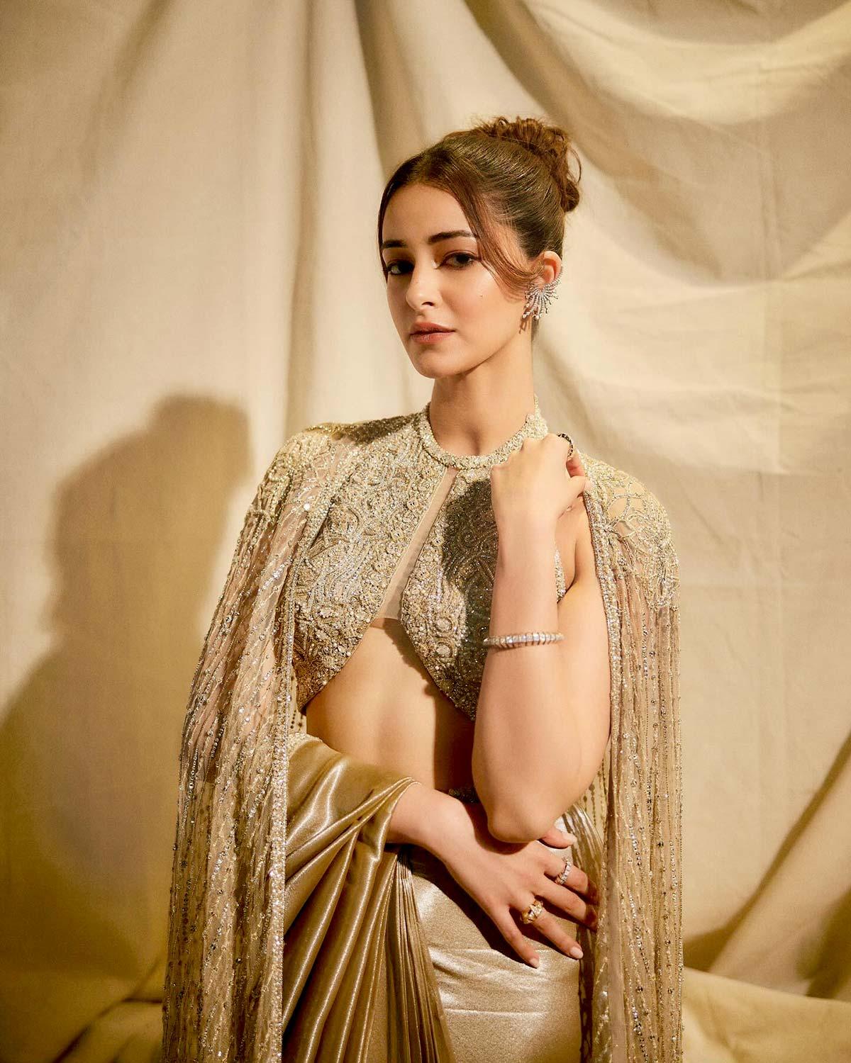 IMAGE: Ananya Panday adds an eccentric touch to her modish pre-draped sari with a diamond spider-shaped earring which is seriously statement-making. Photograph: Kind courtesy Ananya Panday/Instagram