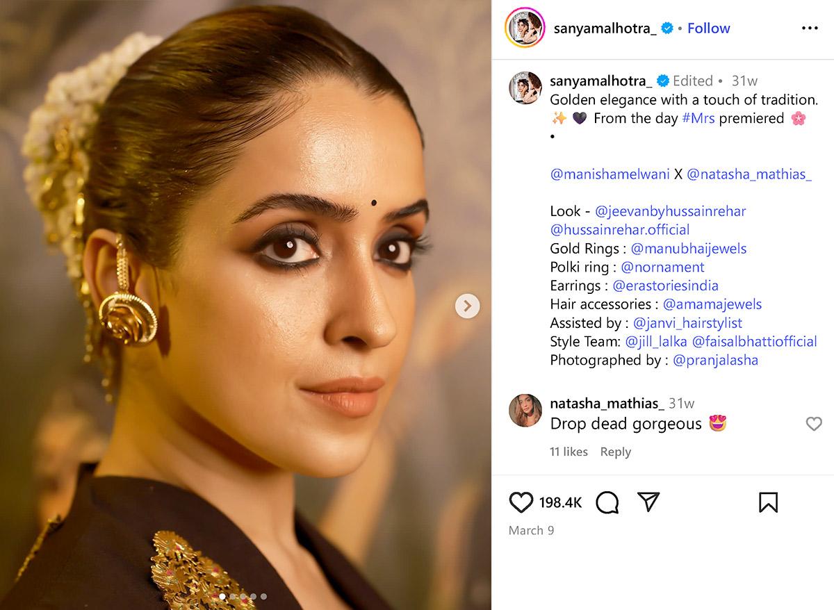 IMAGE: Sanya Malhotra keeps it artsy and adorable with a gold rose-shaped ear chain, tight bun and gajra; after all, even the prettiest petals can have a little edge. Photograph: Kind courtesy Sanya Malhotra/Instagram