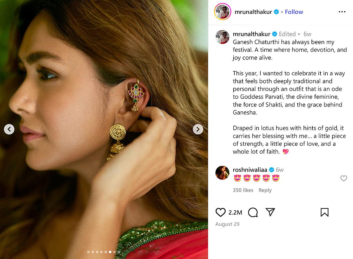 IMAGE: Mrunal Thakur’s dainty kundan earring is for all the girls who love the bling but not bruised earlobes. Photograph: Kind courtesy Mrunal Thakur/Instagram