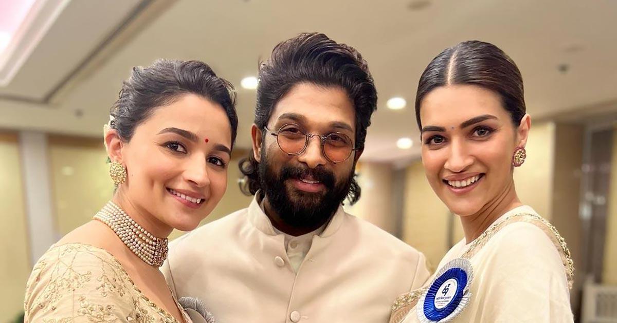 Kriti, wearing a rather interesting sari, poses with her award-winning colleagues, Alia Bhatt and Allu Arjun.