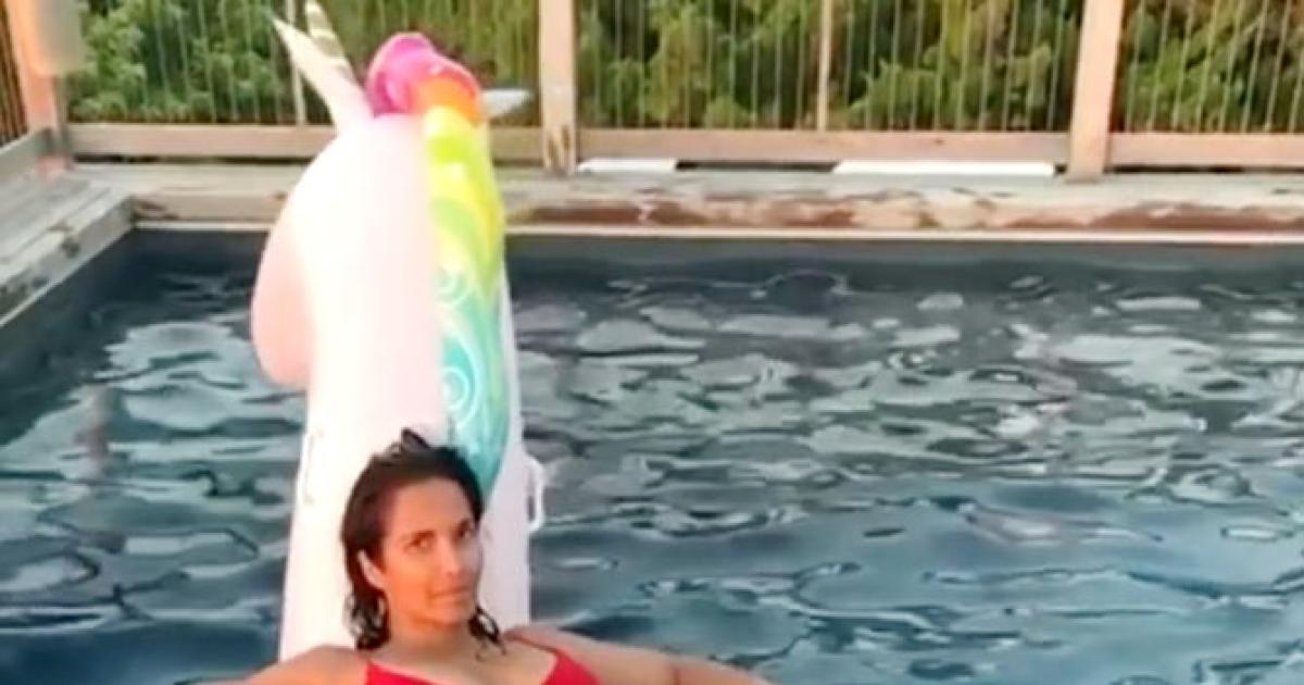 IMAGE: It's a pool day for Padma Lakshmi who flaunts her curves in a red two-piece.
