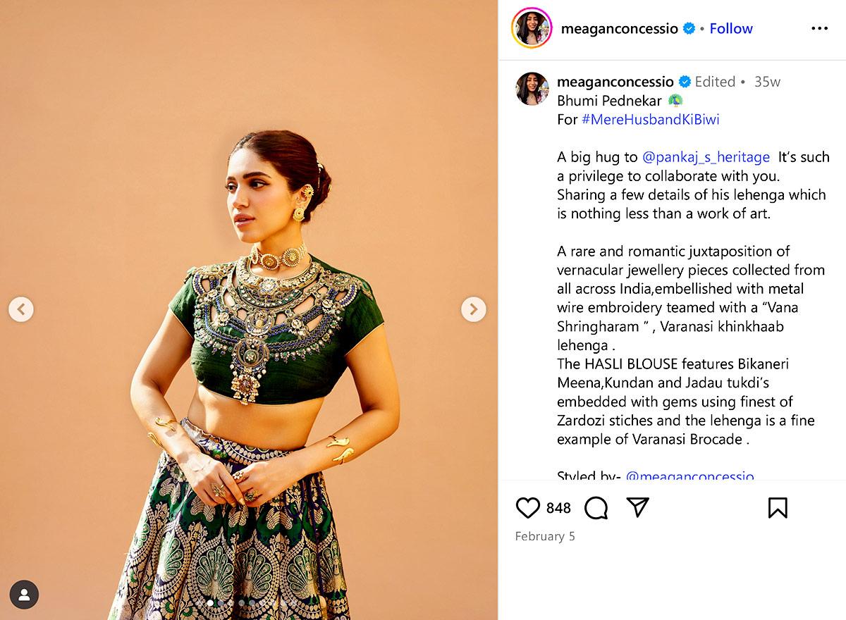 IMAGE: Bhumi Pednekar’s green lehenga makes a strong case for going dupatta-free. With a heavily embellished neckline, a centre brooch and a matching choker, the blouse already does all the heavy lifting. Photograph: Kind courtesy Meagan Concessio/Instagram