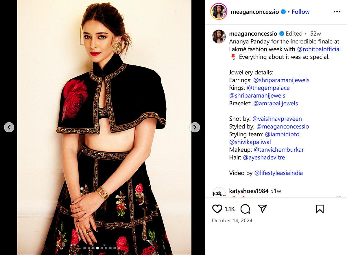IMAGE: Ananya Panday gives the classic lehenga a cool twist in black velvet with rose motifs, styling it with a high-neck cape instead of a dupatta. Photograph: Kind courtesy Meagan Concessio/Instagram