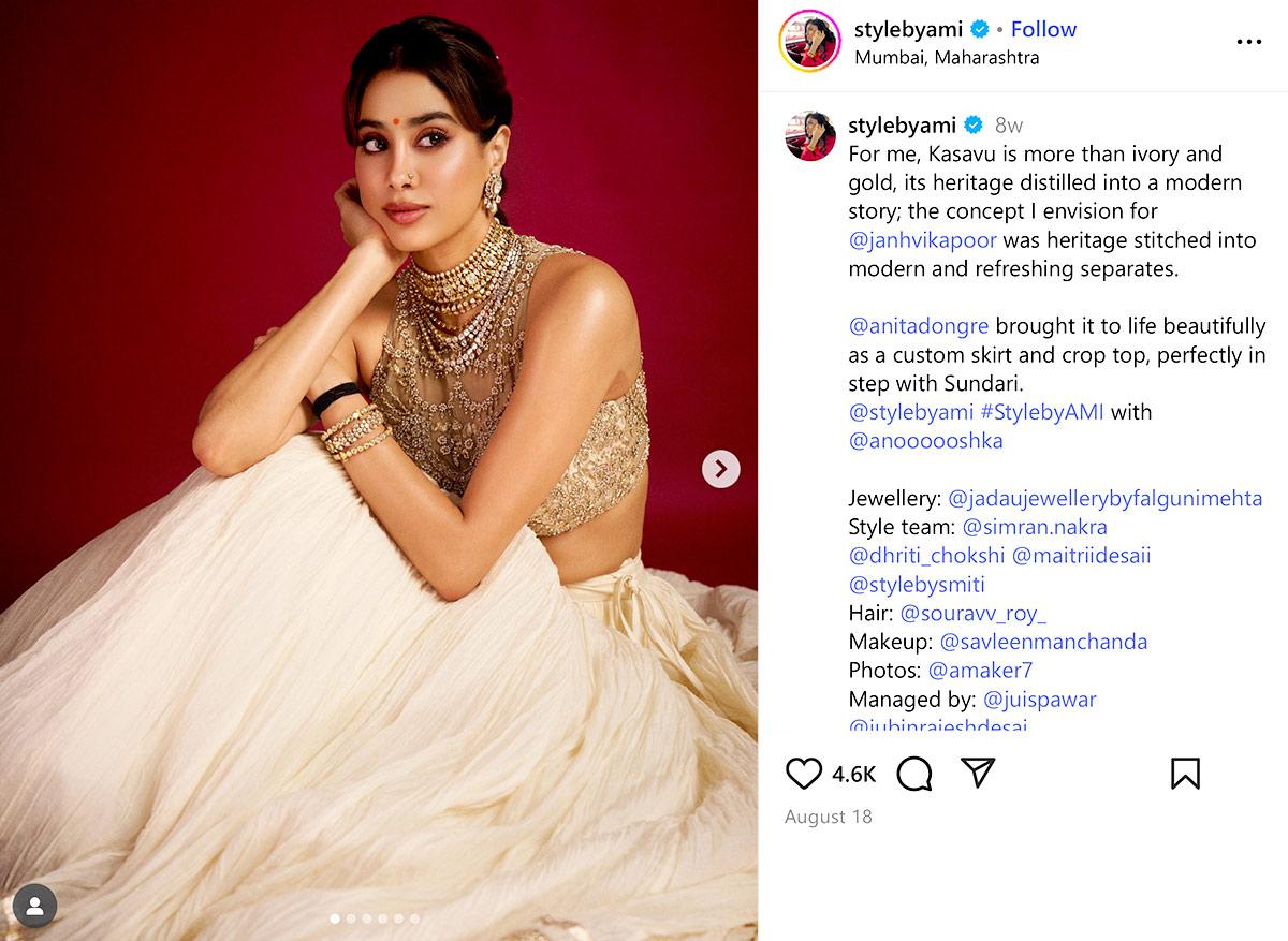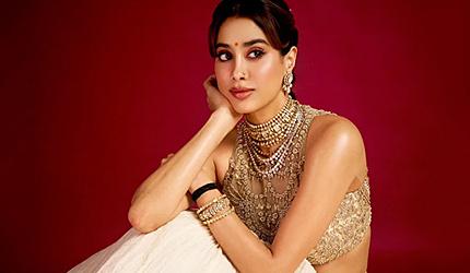 IMAGE: Janhvi Kapoor layers her gold blouse with necklaces ensuring that the dupatta’s absence isn’t even noticed. Photograph: Kind courtesy Janhvi Kapoor/Instagram