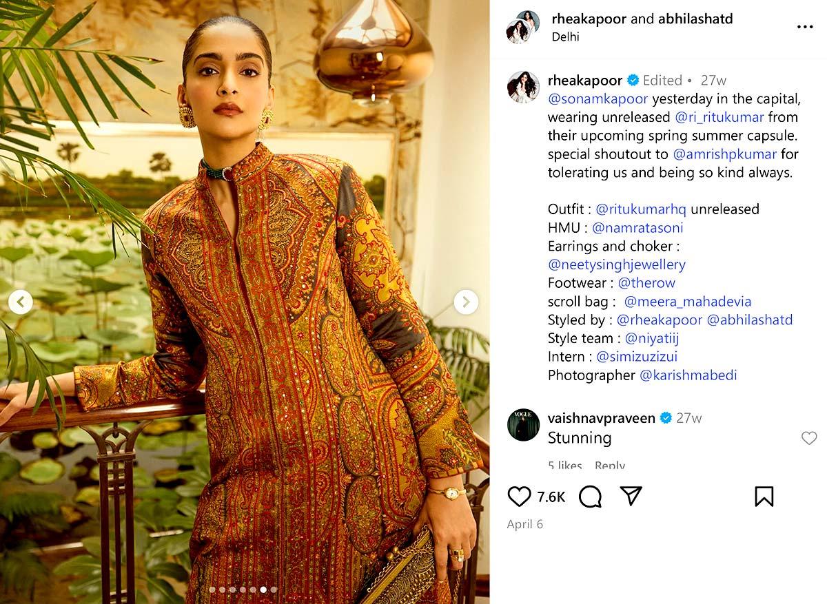 IMAGE: Sonam Kapoor shows another way to skip the extra fabric -- wear a heavily designed bandgala kurta with statement earrings. Photograph: Kind courtesy Rhea Kapoor/Instagram