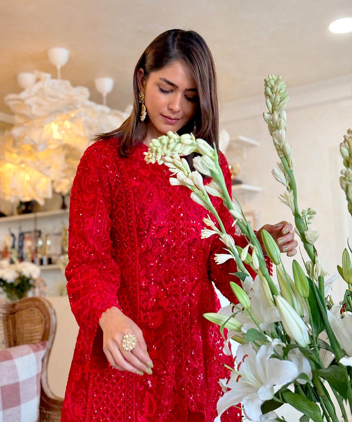 IMAGE: Mrunal Thakur keeps it breezy in a red kurta with a relaxed silhouette. When your fit flows so effortlessly, a dupatta only cramps the vibe. Photograph: Kind courtesy Mrunal Thakur/Instagram