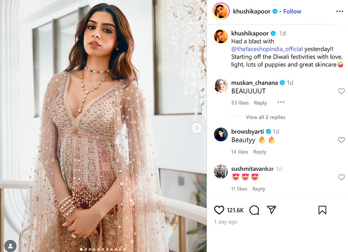 IMAGE: Sheer capes give the best proxy for a dupatta and Khushi Kapoor proves it in her sharara and short kurti set, accessorised with layered necklaces. Photograph: Kind courtesy Khushi Kapoor/Instagram