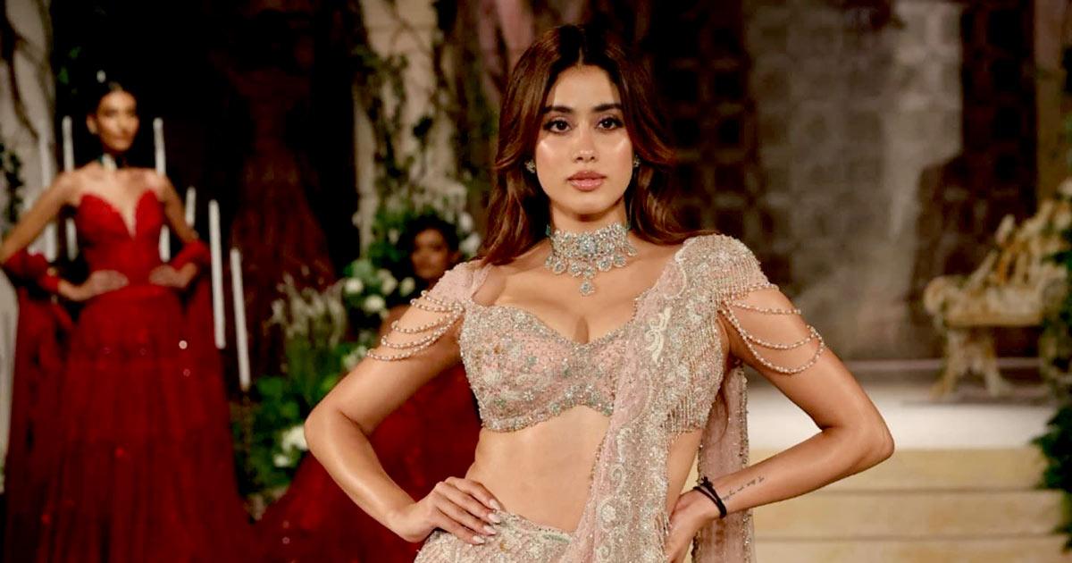A bit of drama, a lot of dazzle -- that's how Jahnvi Kapoor presented designer Jayanti Reddy's blush pink lehenga sari.