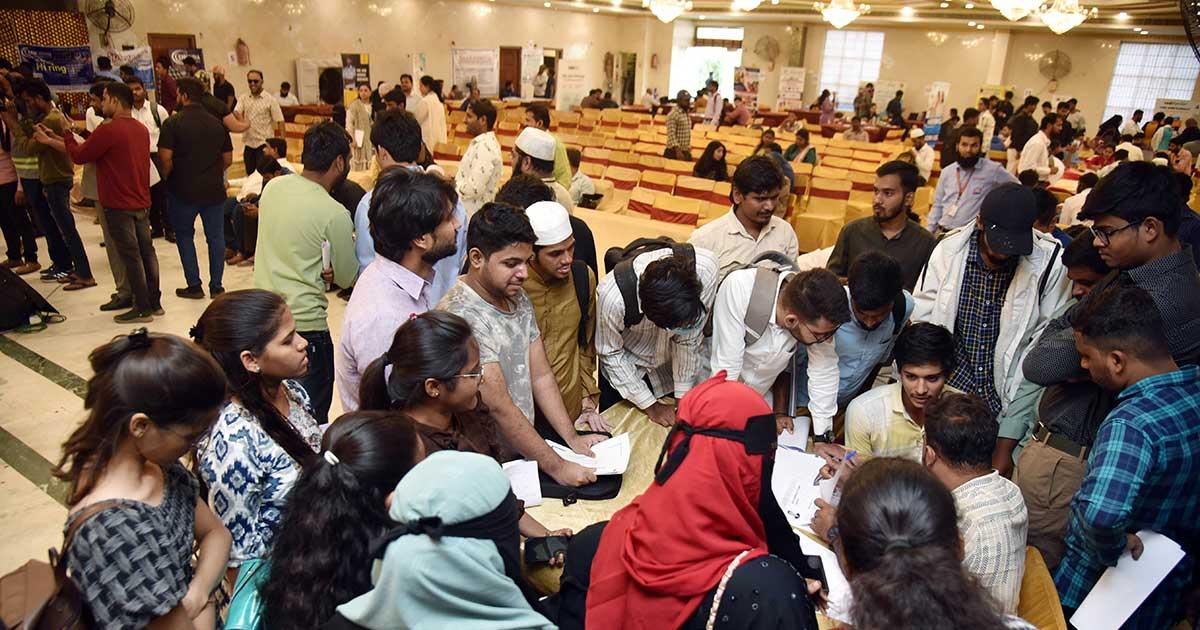 Job aspirants fill forms at the City Job Fair 2023 in Hyderabad. Photograph: ANI Photo