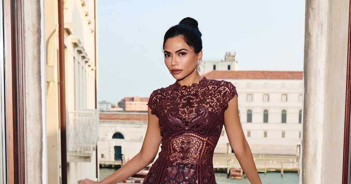 Mona chose a sultry Dolce & Gabbana lace dress in earthy brown, featuring delicate floral embroidery over a structured black underdress. She complemented the look with diamond earrings, statement rings and a sleek bun.