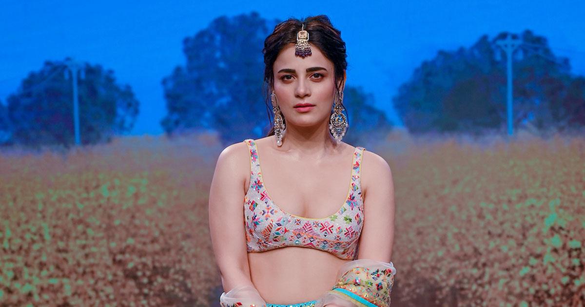 IMAGE: Radhika Madan was eye-candy on the ramp in a colourful phulkari lehenga, paired with a deep round neck choli and dupatta.