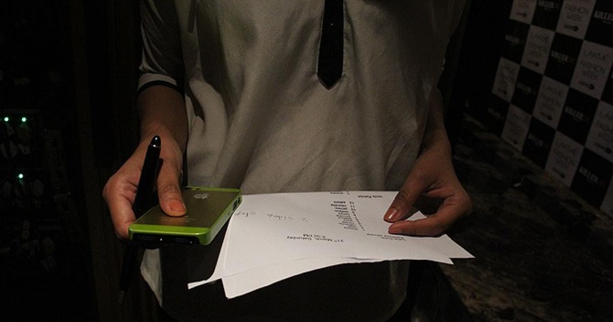 A model checking out the queue list during the backstage rehearsals. The Q list is the order of appearance for models that they follow on the ramp during shows.