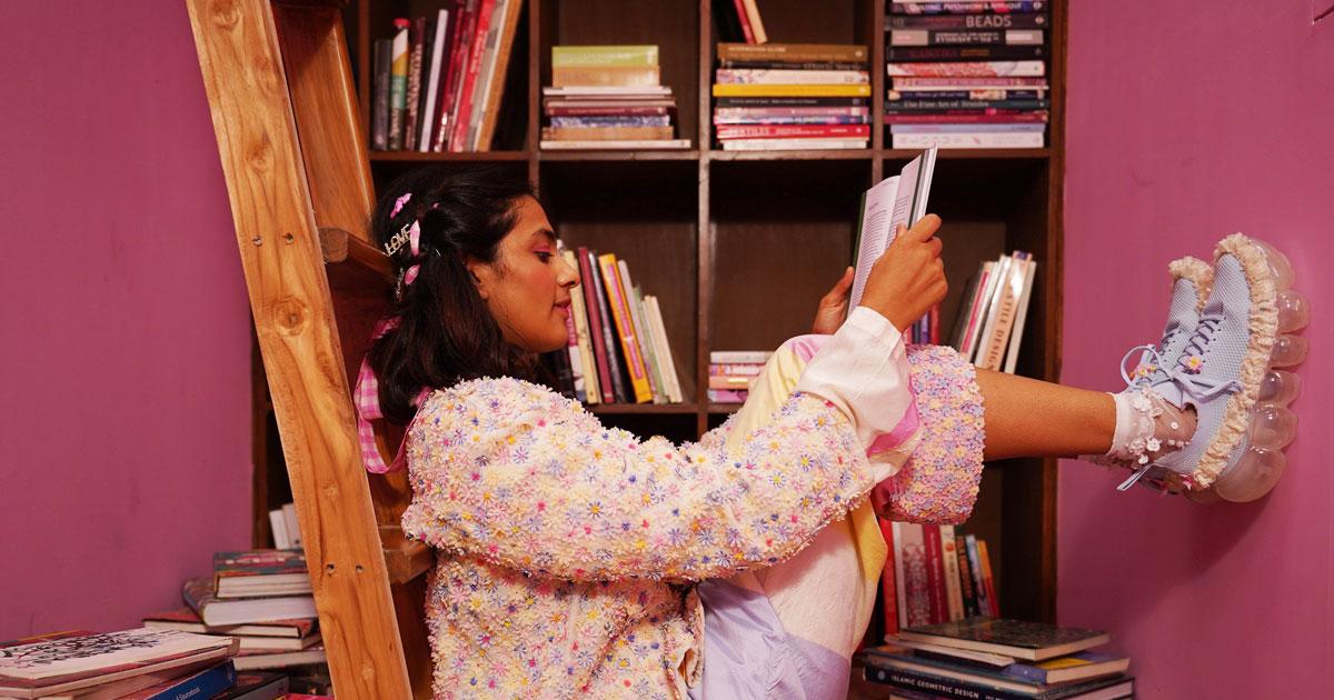 Aneeth also collaborated with the shoe brand, Grounds, from Japan. Grounds is known for their signature high and transparent soles. Upcycled hand embroidery and flower sequins complete the look.