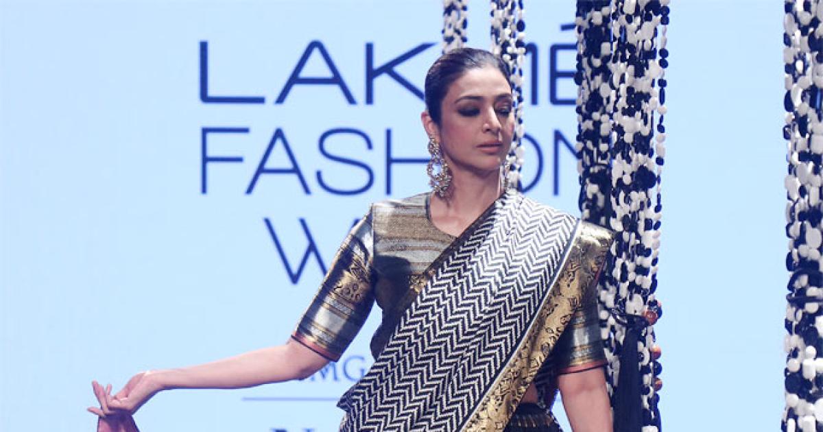 IMAGE: Tabu walked the ramp for designer Gaurang Shah in a black kanjeevaram lehenga with gold and silver border, teamed with a sari draped like a dupatta. With her hair tied back in a tight bun, she completed the look with intricate jewellery and kohl eyes.