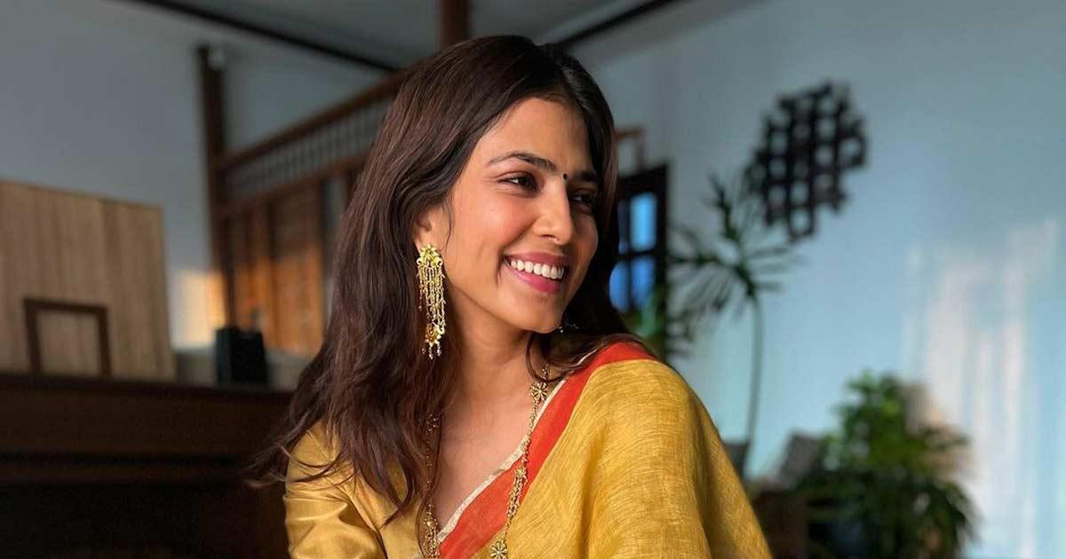 IMAGE: When you look past that infectious smile, you can take a moment to admire Malavika's gorgeous yellow-and-red handloom sari.