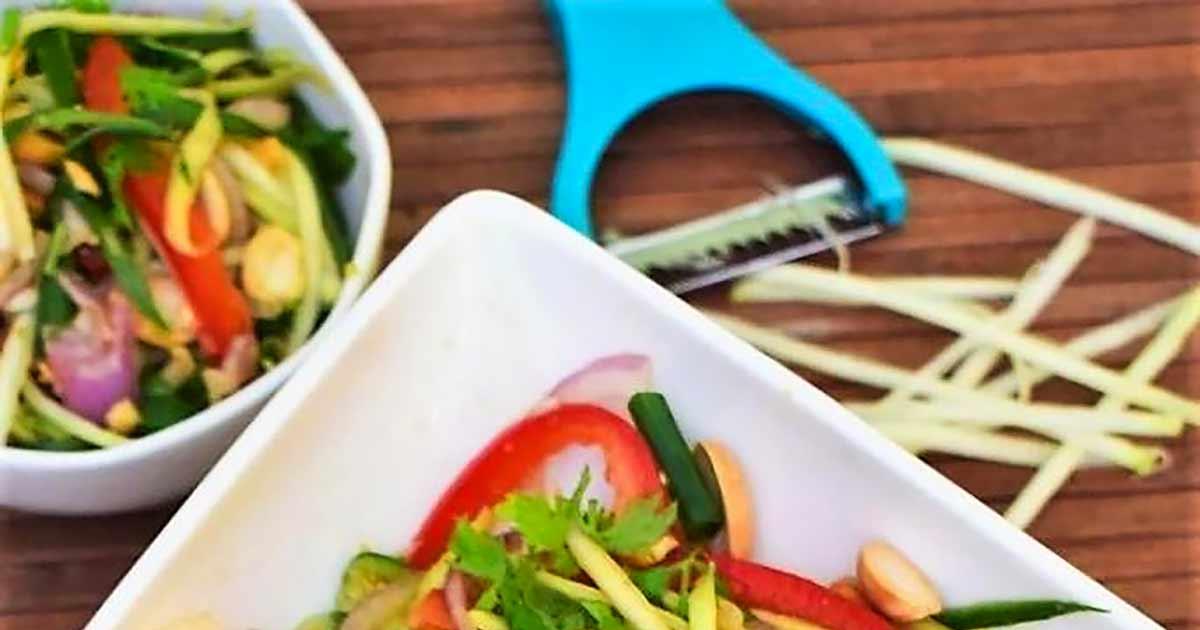 NOTE: Julienne the raw mango using a mandoline slicer or a julienne or zigzag peeler (please see the picture above) or employ some deft knife skills. Mandoline slicers and/or juilenne peelers are useful kitchen implements and can be purchased online.