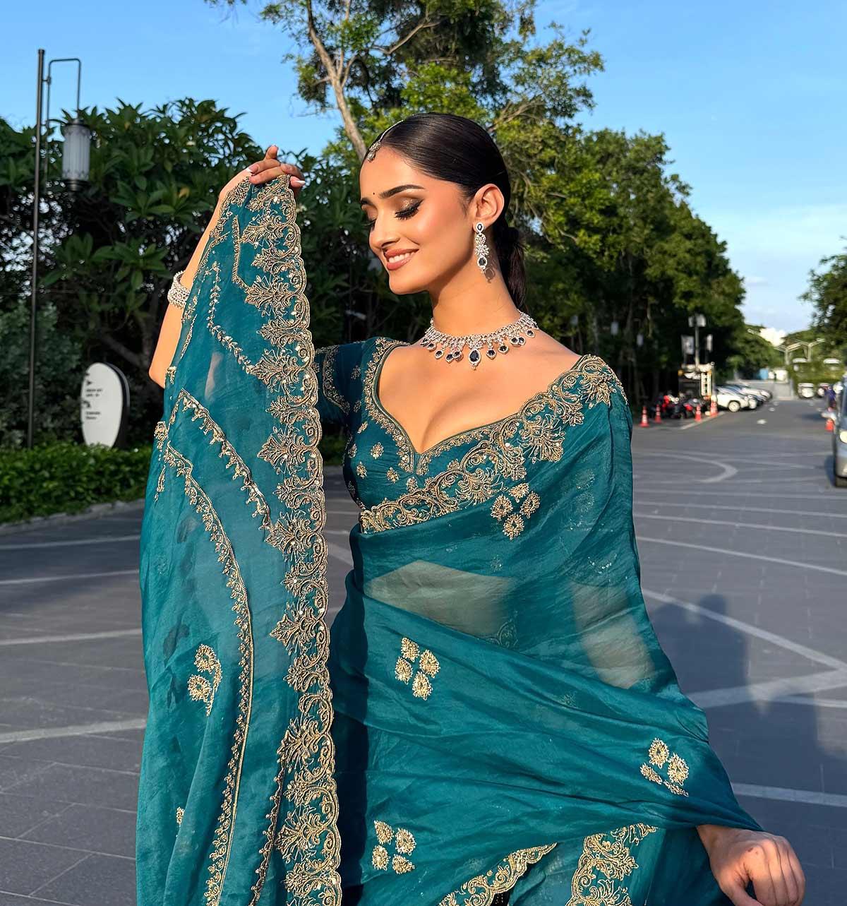 IMAGE: Manika exudes classic pageant royalty as she dresses up in a turquoise sari with gold embroidery for an interview.