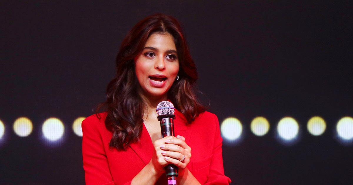 IMAGE: Suhana Khan, scorchingly sultry in scarlet, gets onboard, with mic, speech and all.