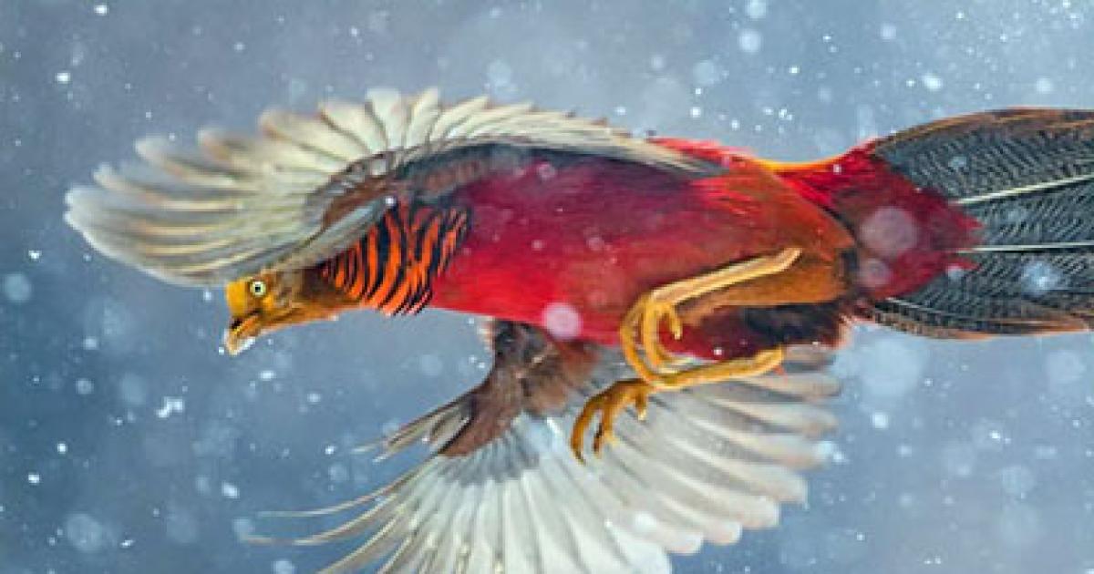 In the Lishan Nature Reserve in Shanxi Province, China, Qiang watched as two male golden pheasants continuously swapped places on this trunk - their movements akin to a silent dance in the snow.